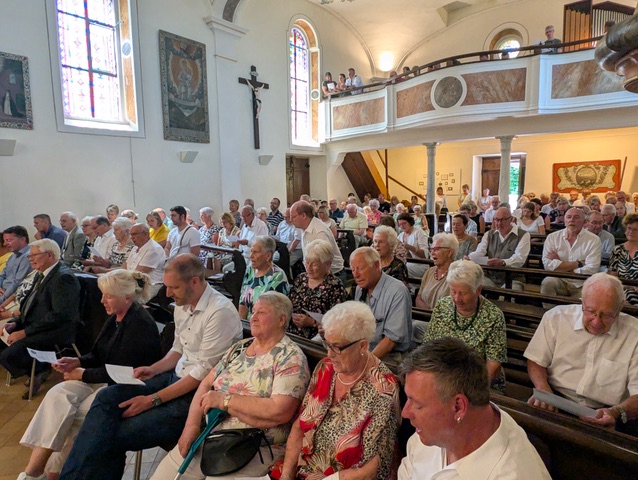 Mit einem feierlichen Festakt am 29.06.2025 konnte der Förderverein Wallfahrtskirche Maria Zell sein 770-jähriges Jubiläum gebührend feiern. Die Kapelle war sehr gut besucht. Eröffnet wurde der Festakt mit einem Arrangement für Orgel und Trompete, "Highland Cathedral", von Markus Bogenschütz an der Zeller Orgel und Bernd Locher an der Trompete. Die Begrüßung der zahlreichen Gäste, u.a. Bürgermeister Philipp Hahn, Dekan Michael Knaus, Pfarrer Professor Achim Buckenmaier, Burgverwalterin Anja Hoppe, erfolgte durch die Ortsvorsteherin Meta Staudt. Passend zur herrlich ausgeschmückten Wallfahrtskirche umrahmte das Querflötenensemble der Jugendmusikschule Hechingen unter der Leitung von Hanns Stefan Doege die Feier musikalisch. Bürgermeister Hahn, als "Hausherr", hiess die Gäste ebenfalls willkommen. Er ging in seiner Ansprache auch auf die Geschichte des Kirchleins ein. 1255 am Silvestertag die Erstnennung der Siedlung "Zell" durch Werner von Zell. Bewiesen wurde dies im Steuerregister von Konstanz aus dem Jahr 1275 als "Cella". Eine große Rolle in der Geschichte spielt natürlich der Förderverein unter Vorsitz von Peter Beck, der seit der Gründung im Jahr 1998 bis heute Vorsitzender des Vereines ist. Dass das Schmuckstück heute so gut dasteht ist zu einem großen Teil seinem Engagement und seinen Mitstreitern zu verdanken. Zur derzeit noch gesperrten Zufahrt nach Maria Zell konnte er den Anwesenden eine frohe Botschaft überbringen. In den Sitzungen des Ortschaftsrates und des Bauausschusses im Juli soll die Baumaßnahme möglichst noch dieses Jahr auf den Weg gebracht werden. Hierfür sind im städtischen Haushalt € 320.000,-- eingestellt. Nach einem weiteren Vortrag durch das Querflötenensemble unterhielten sich in einem Dialog über das Thema Wallfahrten Dekan Michael Knaus und Pfarrer Professor Achim Buckenmaier durchaus kurzweilig. Födervereinsvorsitzdender Peter Beck ging nochmals darauf ein, dass es die Wallfahrtskirche heute auch gar nicht mehr geben könnte Durch die Erdbeben 1970 und 1978 wurde das Kirchlein jeweils schwer beschädigt und es stand auf der Kippe, ob eine Renovierung nochmals Sinn macht. Es wurde damals ein erster Förderverein gegründet unter dem Vorsitzenden Walter Renner. 1982 konnte unter Geläut der alten Glocke den Unterstützern gedacht werden. Becks Dank galt auch den anwesenden Mitgliedern der beiden Fördervereine, städtischen Verantwortlichen, Geistlichen, Handwerkern, Künstlern, Vereinen, Firmen, Unternehmen und allen, die sich um den Erhalt von Maria Zell bis heute verdient gemacht haben. Ein besonderes Dankeschön übergab Meta Staudt an Karola Beck. Die Ehefrau des Vereinsvorsitzenden hält diesem nämlich stets den Rücken frei und kümmert sich auch um den Blumenschmuck in der Kirche.